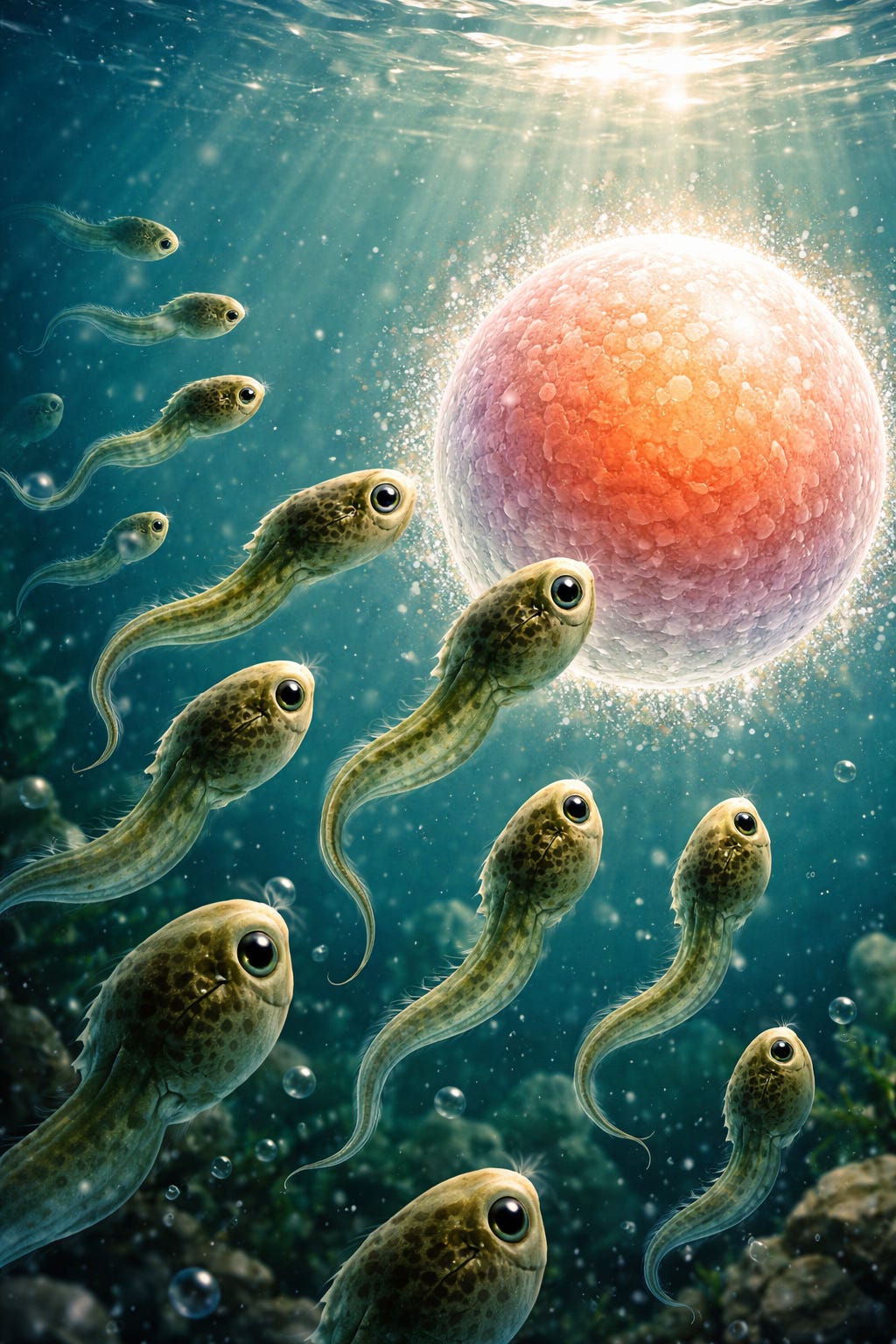 One fertilisation among hundreds of millions of swimmers.