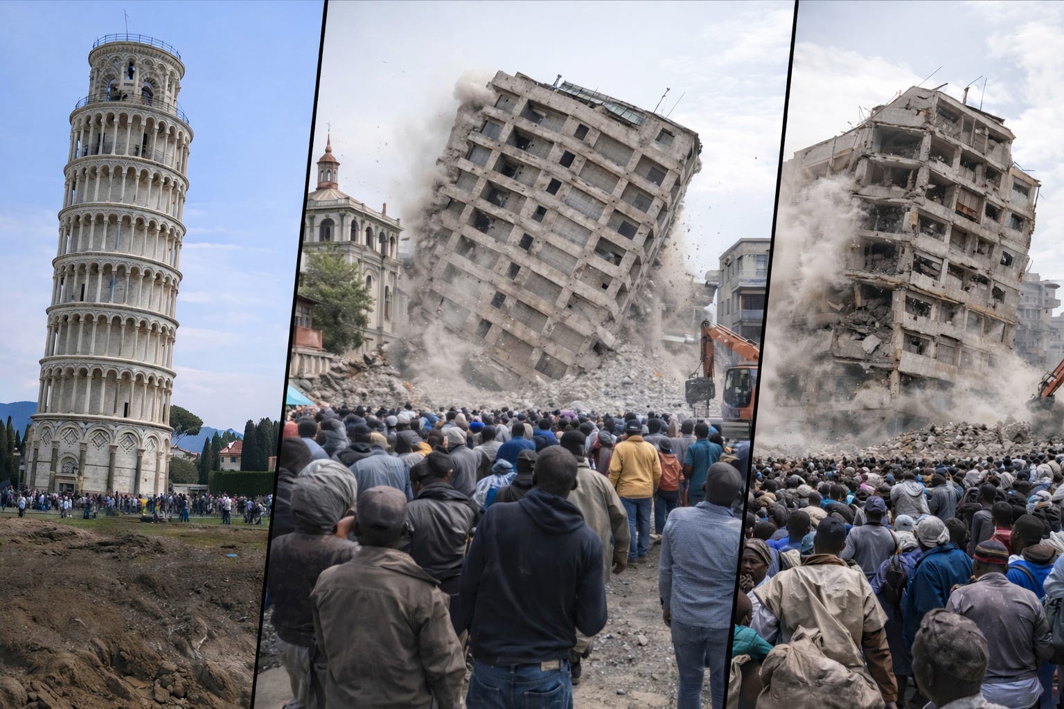 Now fast-forward to Kenya’s leaning towers of Pizza — buildings red-tagged, condemned, evacuated, sometimes ignored… until gravity finishes the conversation.
